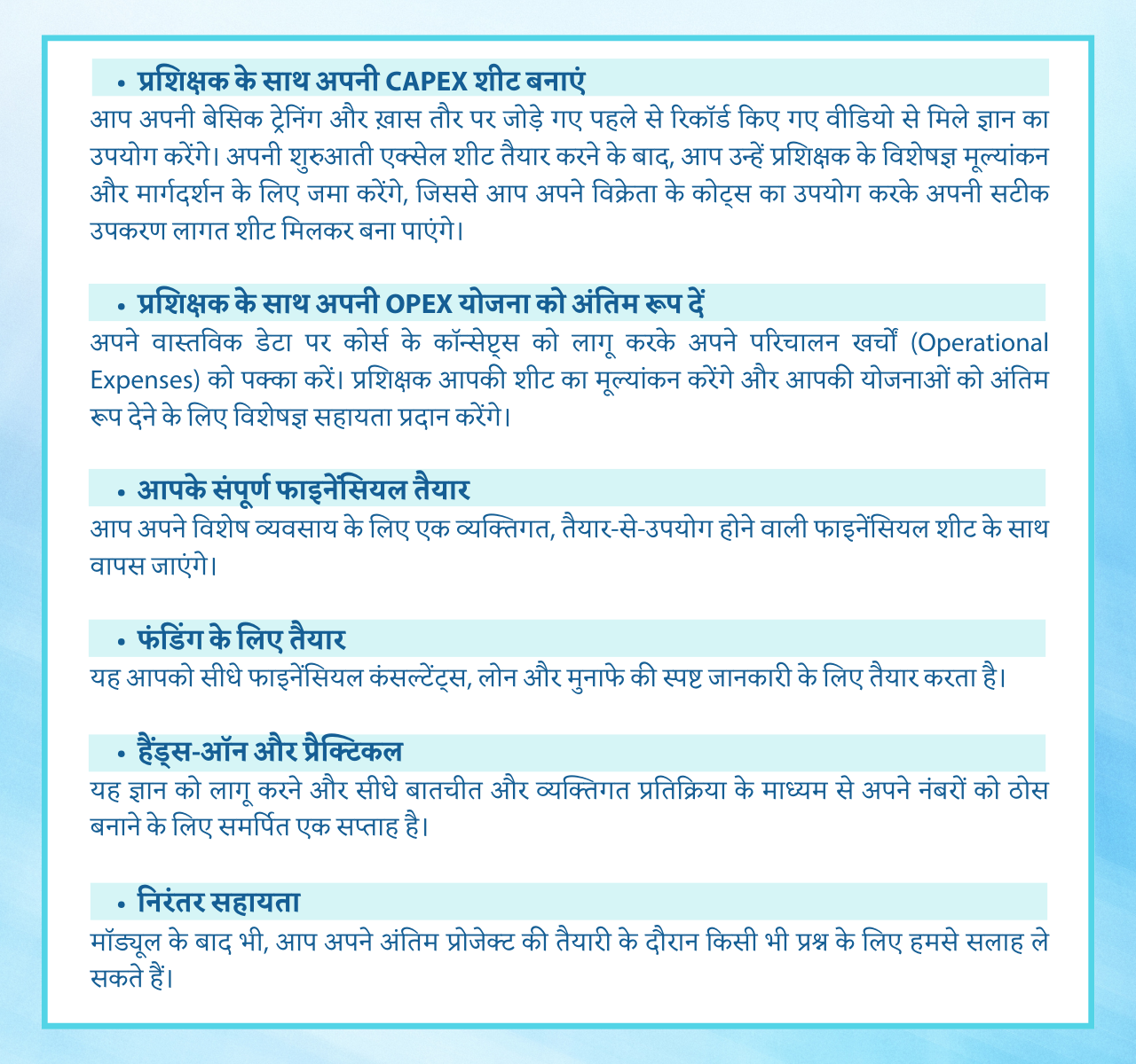 यह एक हफ्ते का गहन प्रशिक्षण आपको अपने बिज़नेस का फ़ाइनेंशियल प्लान खुद से बनाने में मदद करता है। इसमें ये सब शामिल है: